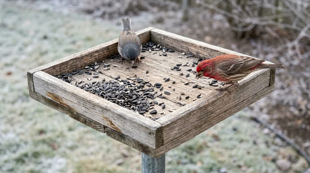 During winter months, cracked corn becomes useful as roughly 20 to 30 percent of the seed mix from December through February. When natural food sources disappear under snow cover, the extra caloric variety helps. White millet works as about 10 percent of the mix and attracts secondary species like doves and juncos without displacing cardinals.