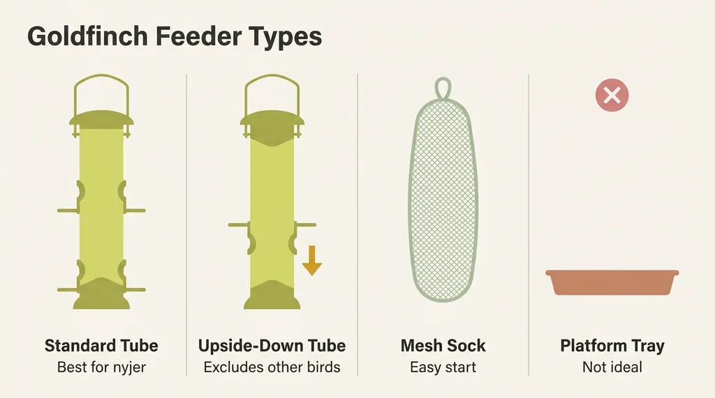 Tube feeders with small ports are the standard recommendation, and for good reason. The small port size is calibrated for nyjer seed and for the relatively small bills of finches. A tube feeder designed for nyjer typically has ports positioned at or above the perches, which works fine for goldfinches but excludes larger birds that can't feed in that orientation.