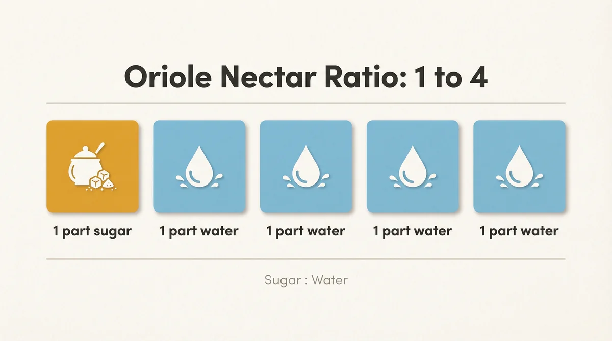 The oriole nectar recipe that actually works is the one that's been working for decades before commercial bird food companies decided to improve on it. One part white granulated sugar. Four parts water. Boil, dissolve, cool, refrigerate. Change it every three to five days, more frequently when temperatures climb.