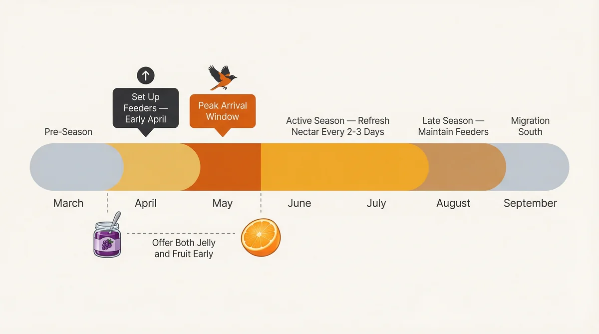 - Set up feeders in early to mid-April, 1-2 weeks before Baltimore Orioles arrive, to capture the critical first-two-weeks-of-May window.
