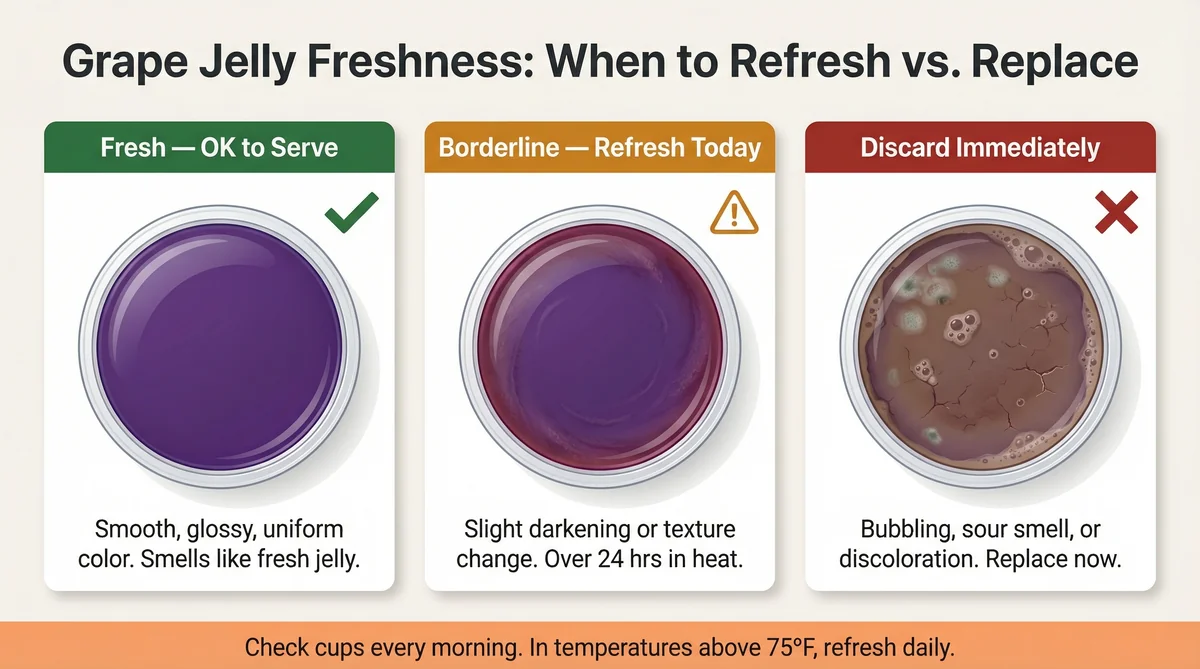 The solution is simple: check and refresh jelly cups every morning, and dump any jelly that looks discolored, smells sour, or has been sitting for more than 24 hours in warm weather. In cooler conditions — the first weeks of May in most northern states — you can stretch to every other day. Once June arrives and temperatures rise, daily refreshing is the minimum standard.