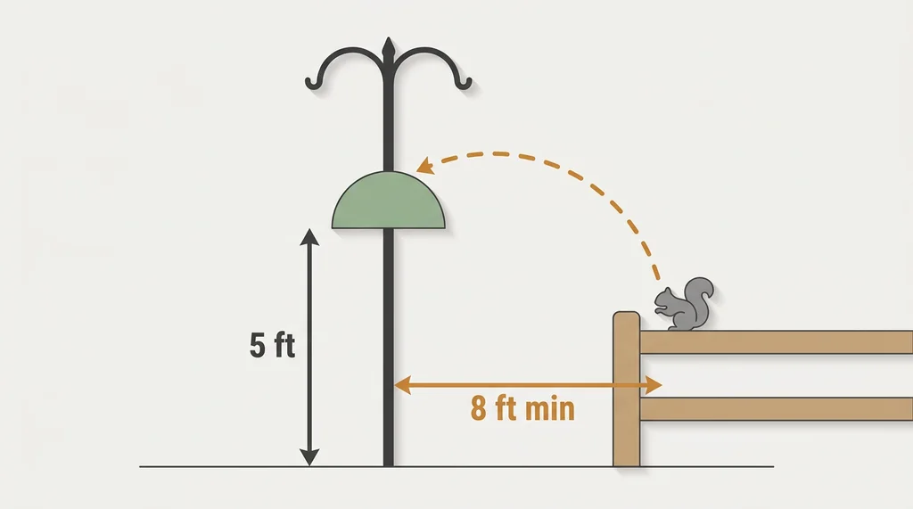 The rule that actually matters: your feeder needs at least eight feet of clearance from any surface a squirrel could use as a launching pad, and your baffle needs to be positioned correctly on that pole. Specifically, baffles should sit at least four feet above the ground — ideally at the five-foot mark on an eight-foot pole — to prevent squirrels from jumping over them from below. Premium squirrel-proof poles stand over 80 inches above ground when properly installed, which gives you the vertical clearance to position a baffle correctly while still having feeder height above it.