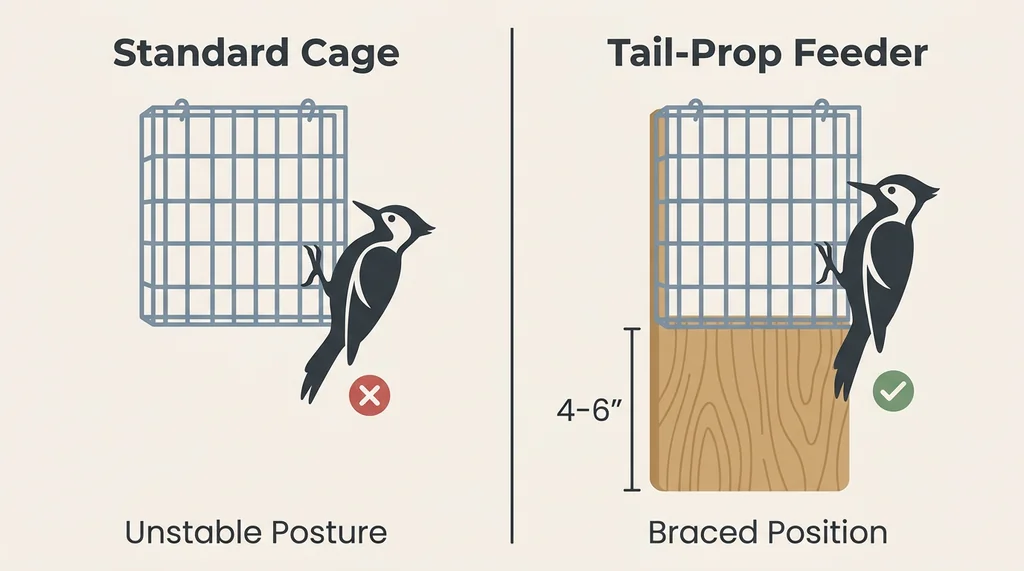 The tail-prop doesn't need to be elaborate. A wooden board extending four to six inches below the suet cage is sufficient. Several commercial feeders incorporate this as a standard feature; others sell it as an add-on. If you're buying a basic wire cage, a piece of scrap cedar screwed to the bottom accomplishes the same thing for essentially nothing.