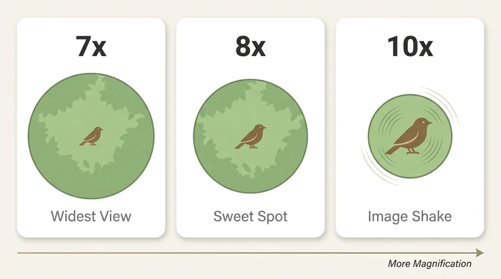 - Choose 8x magnification for general bird watching — 10x narrows the field of view and amplifies hand tremor enough to lose fast-moving birds