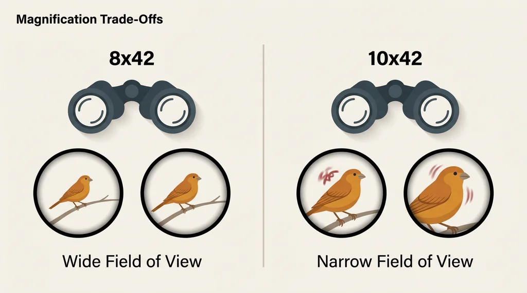 High magnification comes with real trade-offs. A 10x binocular magnifies everything — including the tiny tremors in your hands. At 10x, any movement becomes visible shake, which makes tracking a moving bird genuinely difficult. The field of view (how wide a swath of landscape you can see at once) also narrows as magnification increases, which is exactly the wrong direction when you're trying to find a warbler that just disappeared into a hedgerow.