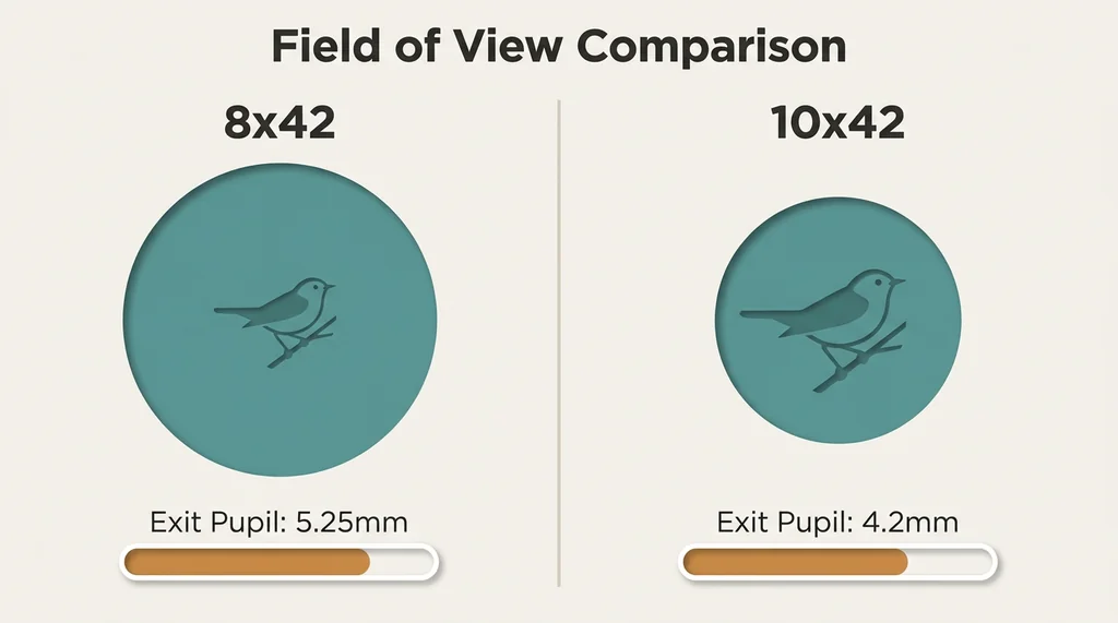 Exit pupil determines low-light performance. The second number in binocular specifications — the 42 in 8x42 — is the objective lens diameter in millimeters. Divide this by the magnification to get the exit pupil: the diameter of the light beam that enters your eye. An 8x42 produces an exit pupil of 5.25mm. A 10x42 produces 4.2mm. The human pupil dilates to roughly 7mm in darkness and contracts to about 2-3mm in bright sunlight.