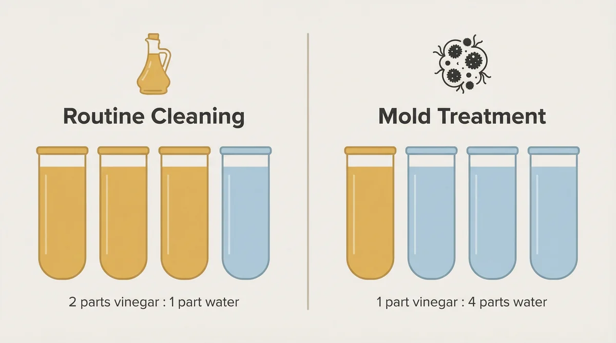 - Clean with a 2:1 vinegar-to-water solution for routine cleaning, or 4:1 water-to-vinegar for mold; always rinse at least three times.